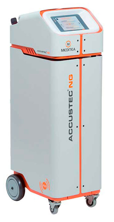 El principio de funcionamiento del ACCUSTEC NG® se basa en la aplicación de un frente de onda acústico de alta densidad de energía extracorpórea, que produce un cambio rápido de impedancia en la interface de los tejidos (piel, células grasas, músculos, etc.). Los efectos biomecánicos producen un aumento transitorio en la permeabilidad de la membrana celular lo que conduce a una mejora en el intercambio de sustancias entre células. De esta manera el estímulo mecánico se convierte en actividad química, a través de la vasodilatación y la neo-vascularización, produciendo hiperemia en todas las capas de tejido, incluyendo el tejido conectivo y estimulando la formación de colágeno.